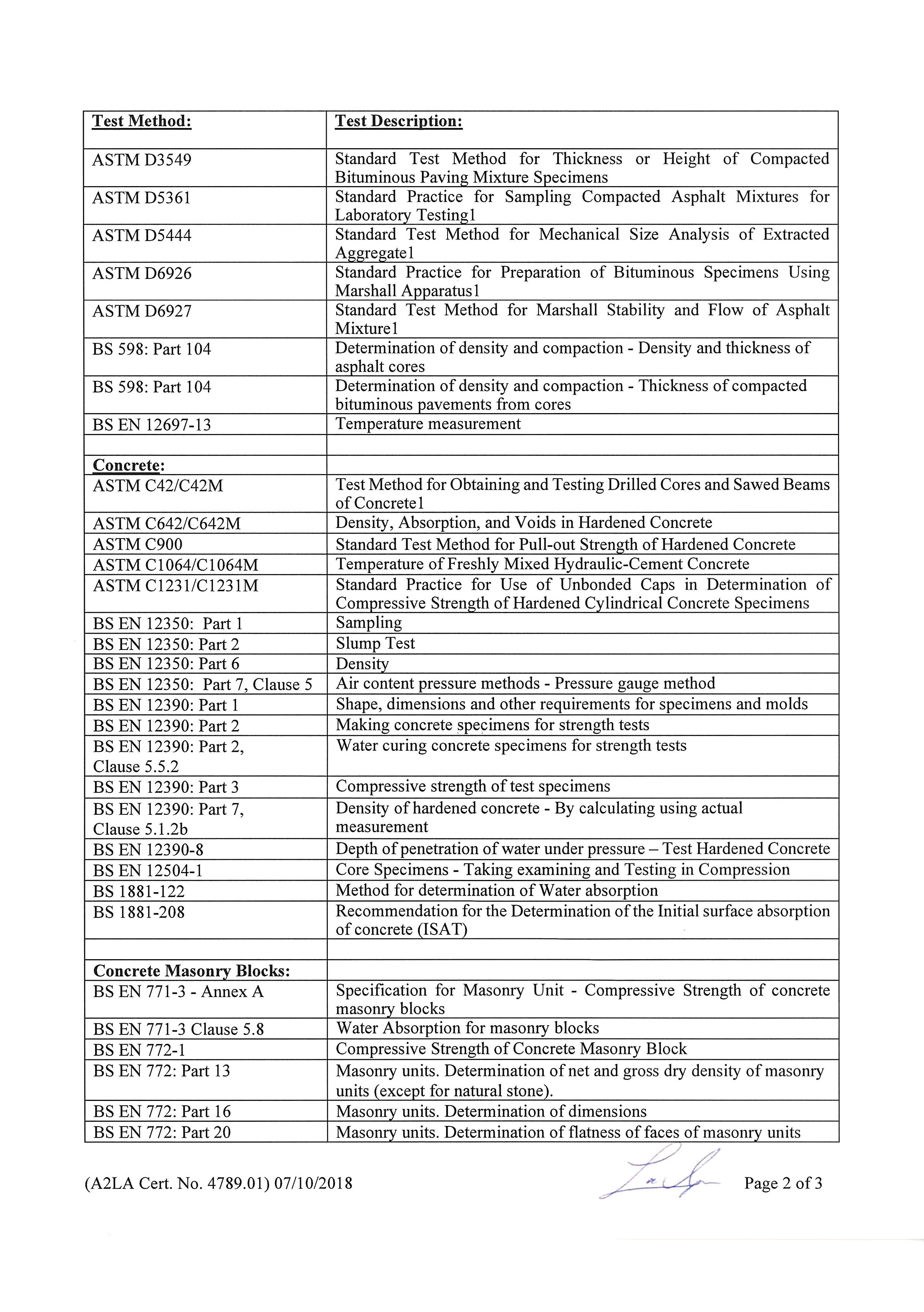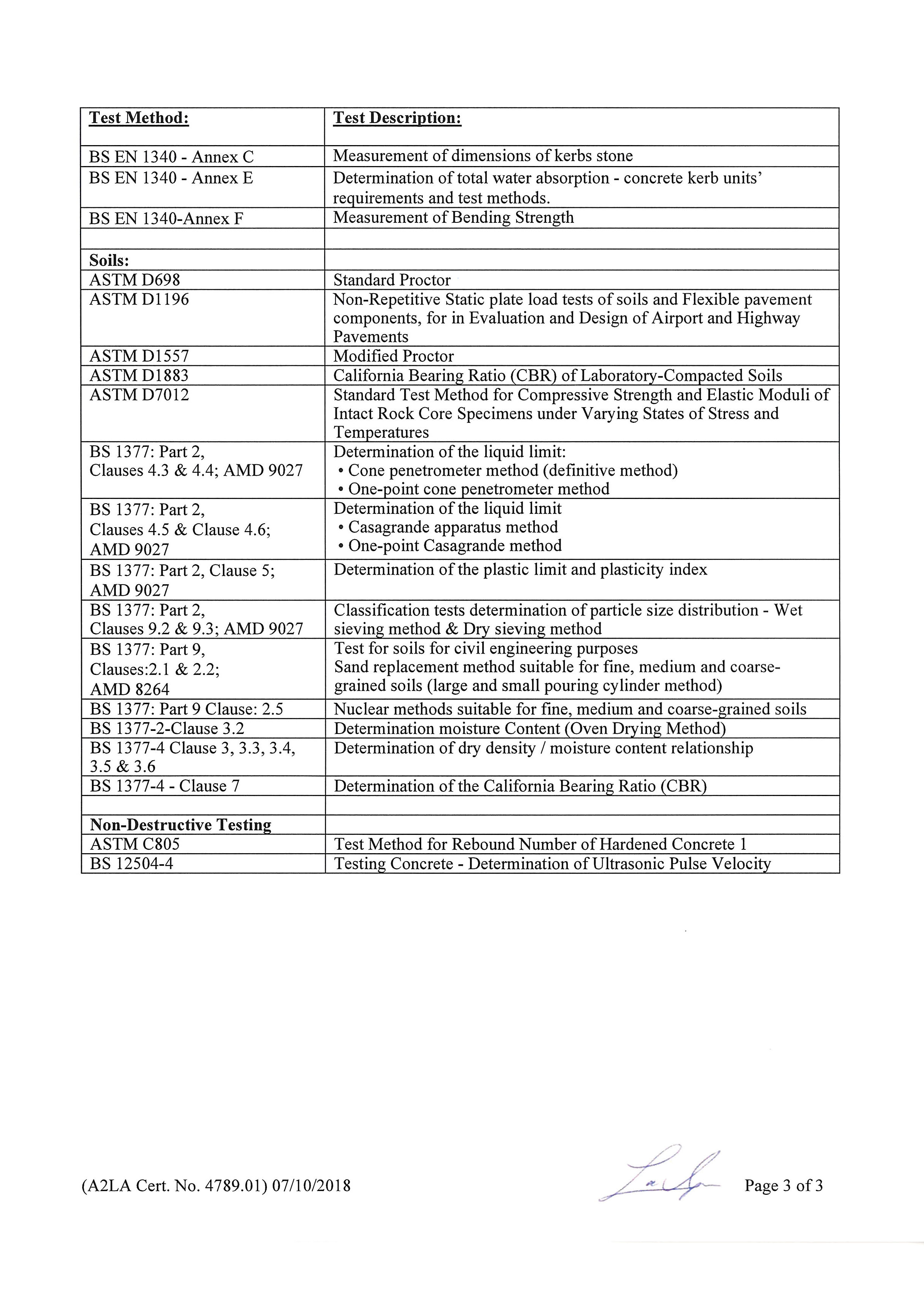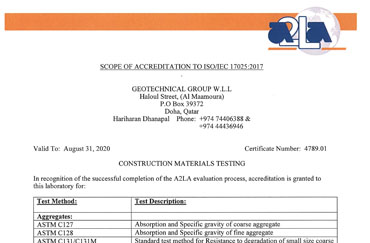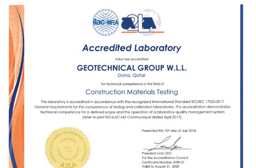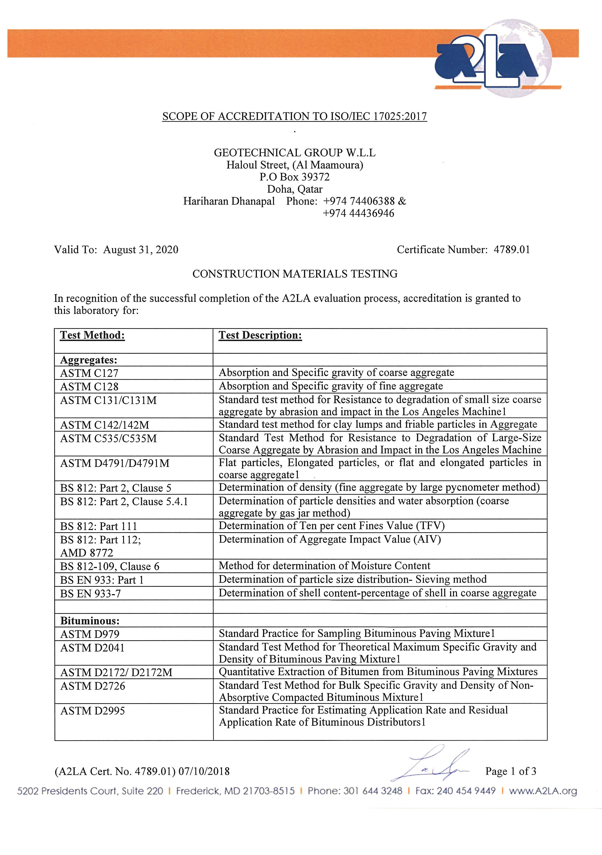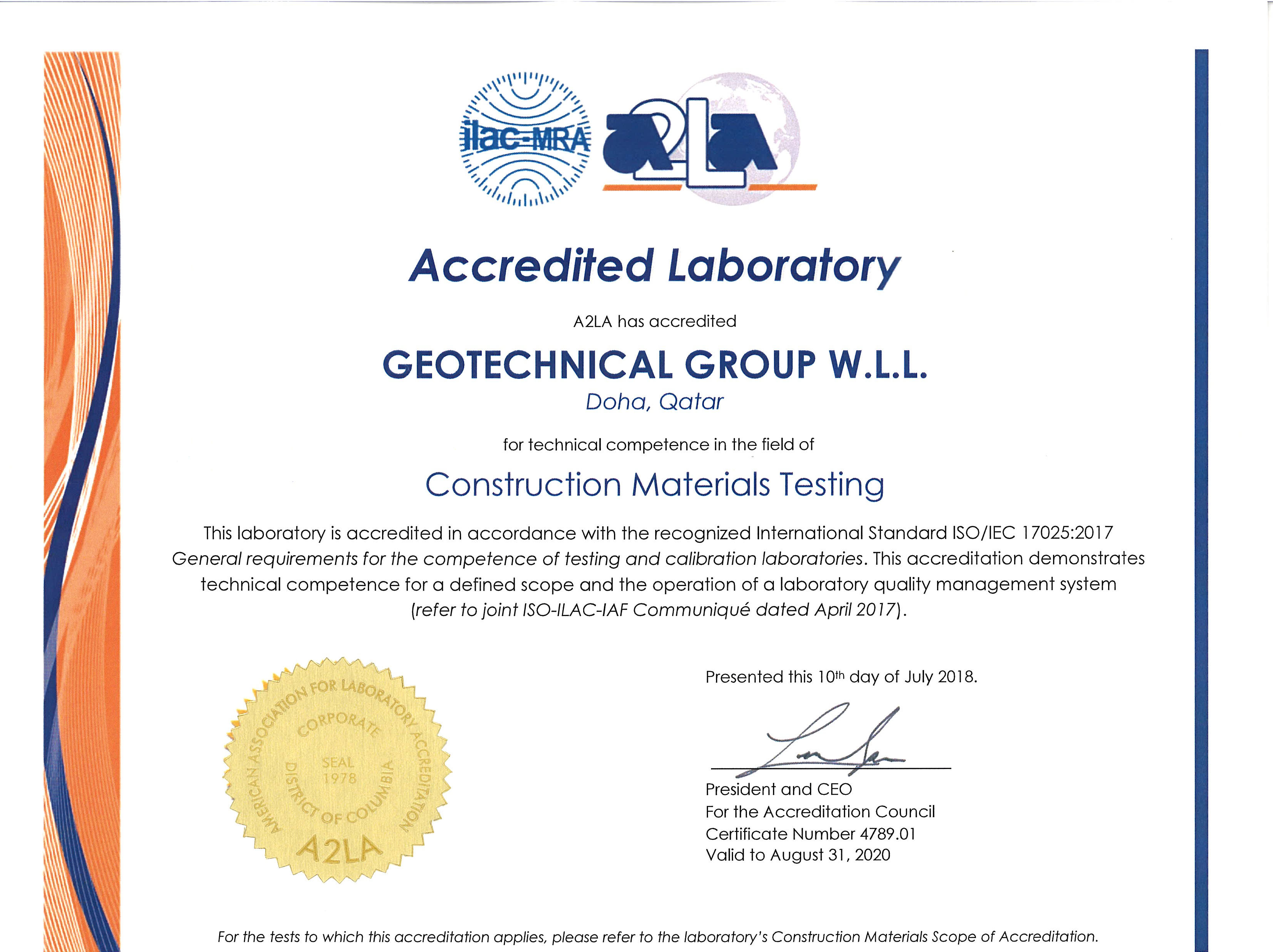 Geotechnical Group Have Been Accredited By The American Association For Laboratory Accreditation (A2LA) In The Construction Material Field Of Testing For The Tests Listed On The Enclosed Scope Of Accreditation. An A2LA Certification Numbered 4789.01 And Valid August 31-2020.